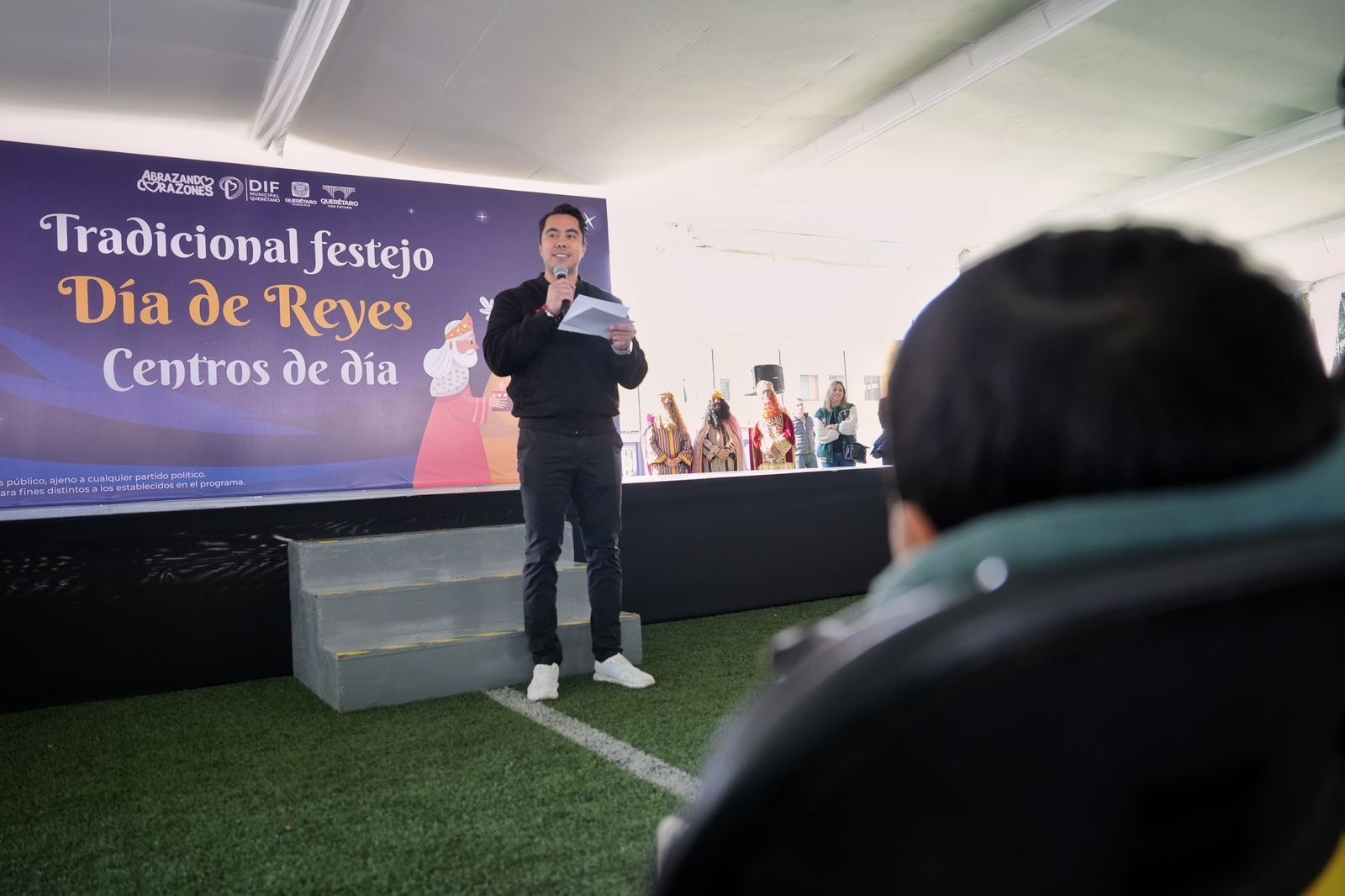 Al acompañar a la presidenta del Patronato del Sistema Municipal DIF, Adriana Olvera de Macías, y a la directora del DIF Municipal, Gabriela Valencia García, en la tradicional celebración del Día de Reyes, organizada para 150 niñas y niños de los Centros de Día Njhöya, Jädi y Meni, reiteró el compromiso del Gobierno municipal para fortalecer estos lugares y brindar mejores oportunidades a quienes forman parte de ellos.