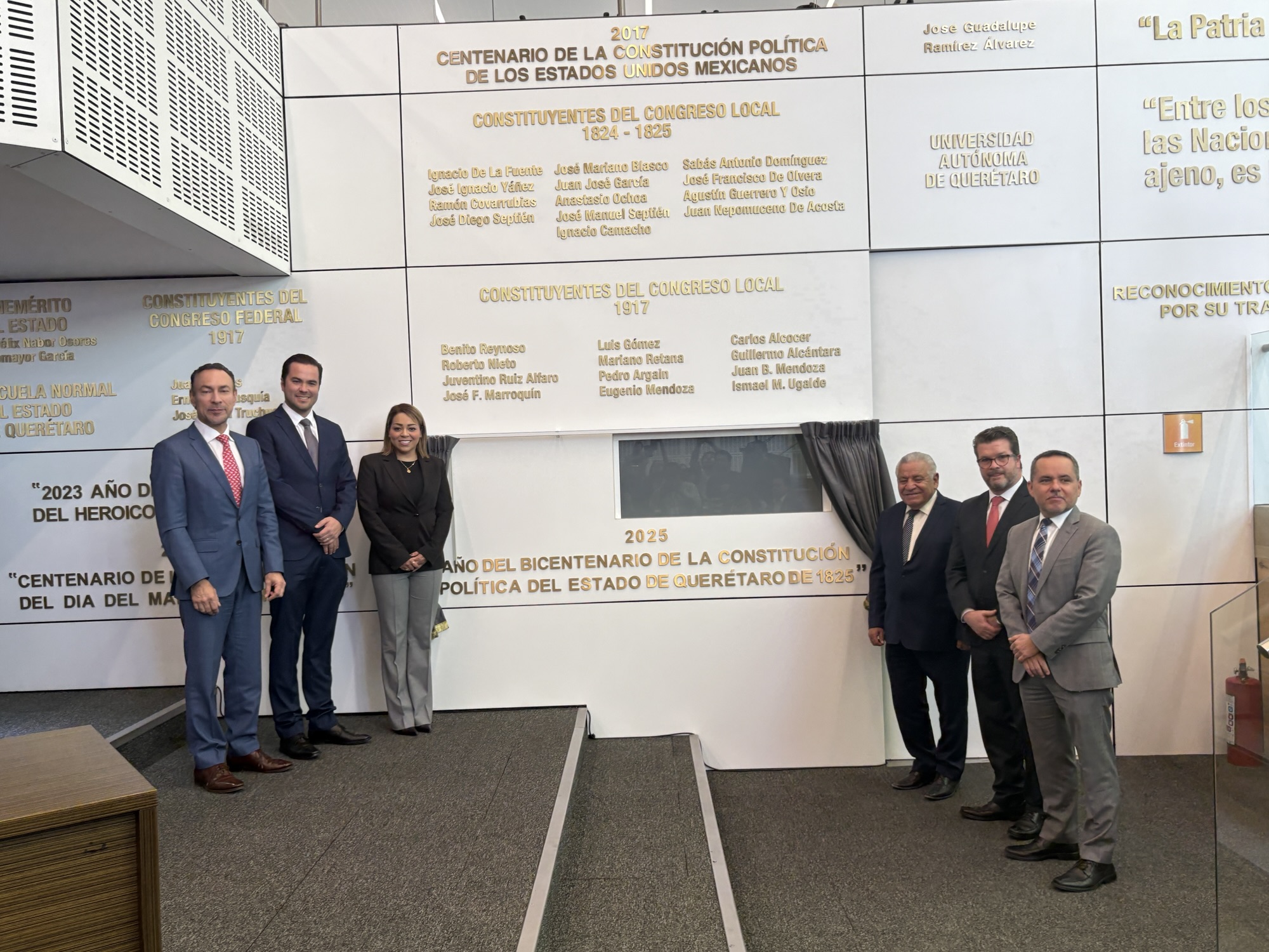 Santiago de Querétaro, Qro., 13 de febrero de 2026.- Con el objetivo de destacar la relevancia histórica de la Constitución Política del Estado de Querétaro de 1825 en la vida institucional de la entidad, se llevó a cabo la develación de letras doradas en el Salón de Sesiones “Constituyentes de 1916-1917”, en homenaje a los 200 años de este documento fundamental.