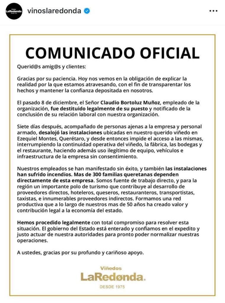 La empresa dijo que 7 días después de su despido de esta persona, regresó acompañado de dos personas y personal armado, quienes desalojaron el viñedo apoderándose de las instalaciones, haciendo uso ilegitimo del lugar, vehículos e infraestructura.