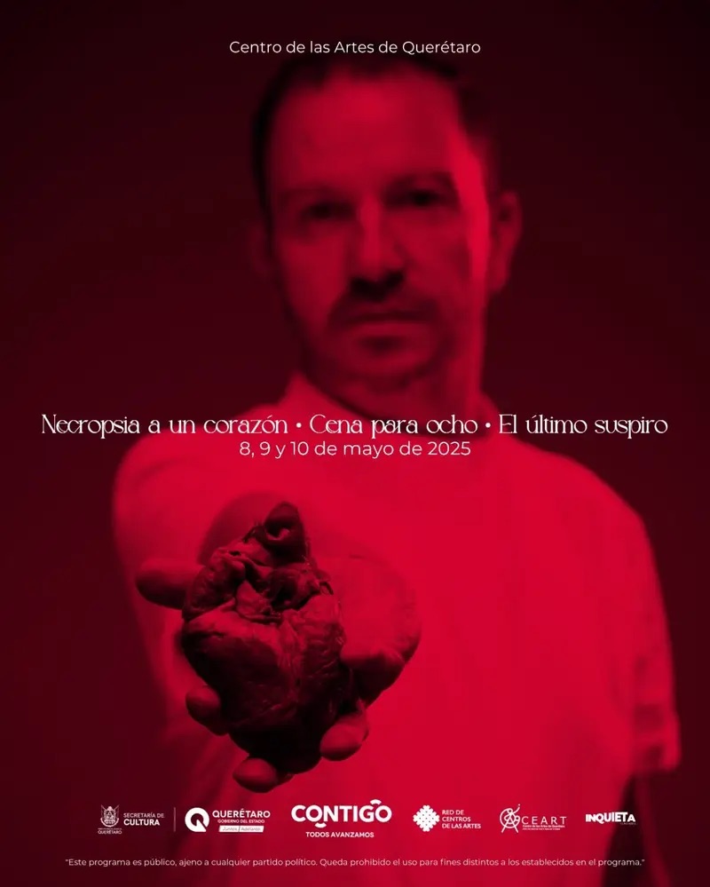 Del 8 al 10 de mayo, en el Centro de las Artes de Querétaro (CEART), se presentará el proyecto “Cardiomancia”, del artista Ricardo Villalobos, que consiste en la puesta en escena “Cena para ocho”, la presentación del libro “El último suspiro” y la exposición “Necropsia a un corazón”.