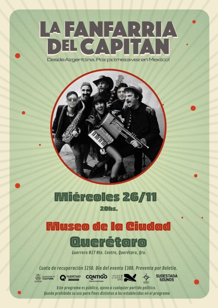 La Fanfarria del Capitán continúa su primera gira por México y tendrá hoy 26 de noviembre una presentación especial en el Museo de la Ciudad de Querétaro, como parte del recorrido que los ha llevado a escenarios del país y al Festival Tecate Comuna en Puebla. La banda argentina, conocida por su mezcla de rock, ska, ritmos latinos y sonidos del mundo, también realiza una sesión musical en las sierras de Amatlán de Quetzalcóatl durante esta visita.