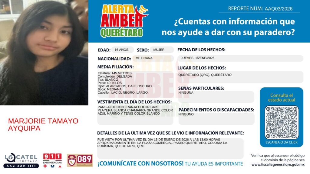 AlertaAMBER | La Fiscalía General del Estado de Querétaro informa que, derivado de la activación de la Alerta AMBER emitida el pasado 17 de enero, se logró la localización de Airam Joseline Lara Montes.