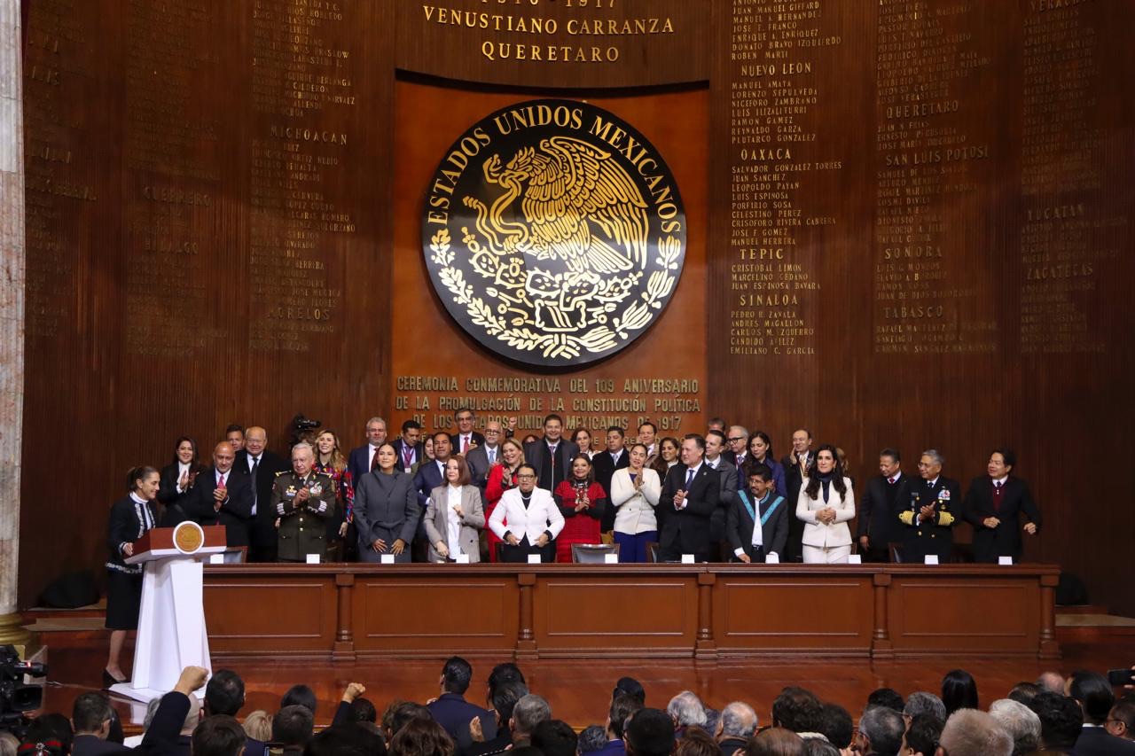 Durante su mensaje en el Teatro de la República por el 109 Aniversario de la Promulgación de la Constitución Política de los Estados Unidos Mexicanos, la jefa del Ejecutivo refirió que México es el resultado de sus transformaciones, y cada transformación dejó su huella en una Constitución, no como letra muerta, sino como expresión viva de la lucha popular.