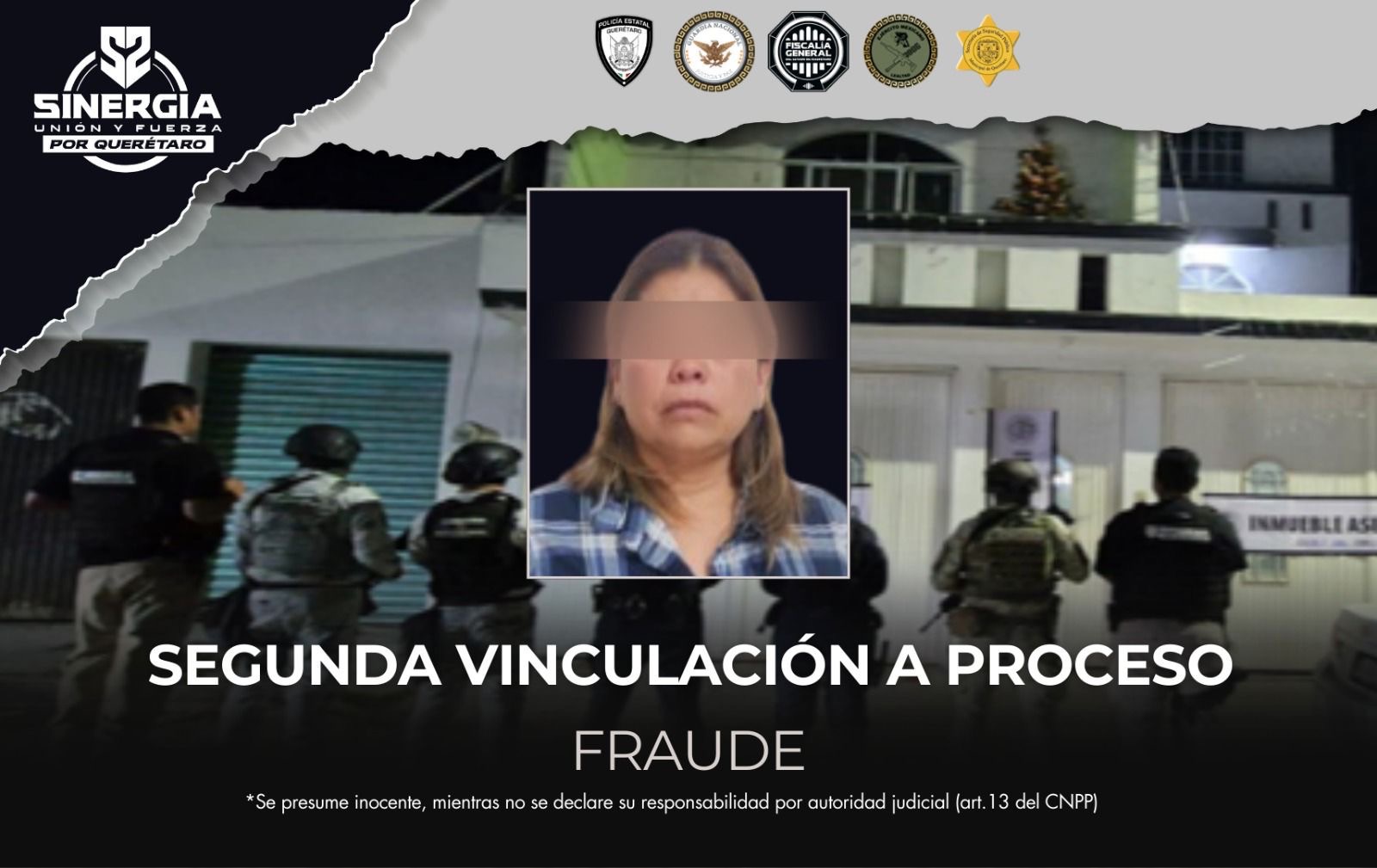 Adicionalmente, como parte de las acciones operativas de Sinergia por Querétaro, se ejecutó un cateo en un domicilio del municipio de Querétaro, donde fueron asegurados más de un centenar de expedientes, documentación y anotaciones vinculadas con las personas ofendidas, los cuales se encuentran en análisis por personal pericial.