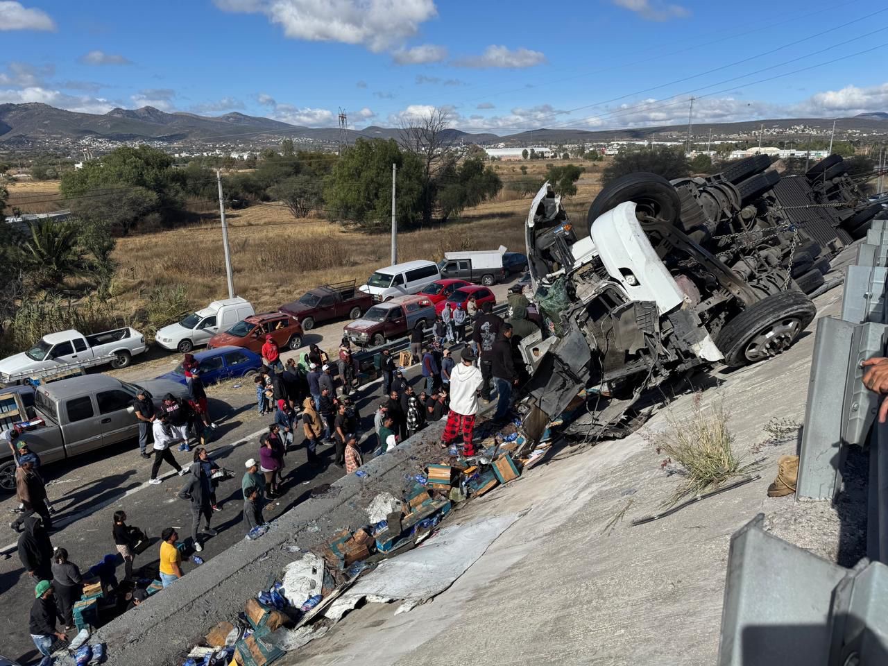 Mientras se realizaban las maniobras para recuperar el vehículo accidentado, varias personas a bordo de vehículos llegaron al sitio para llevarse el producto.